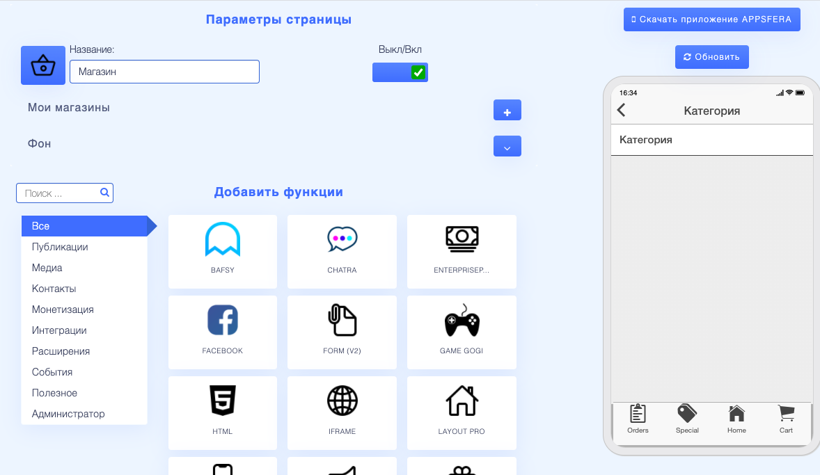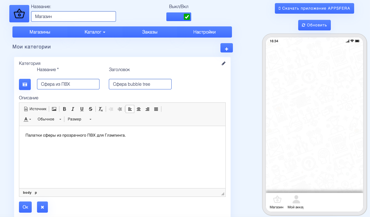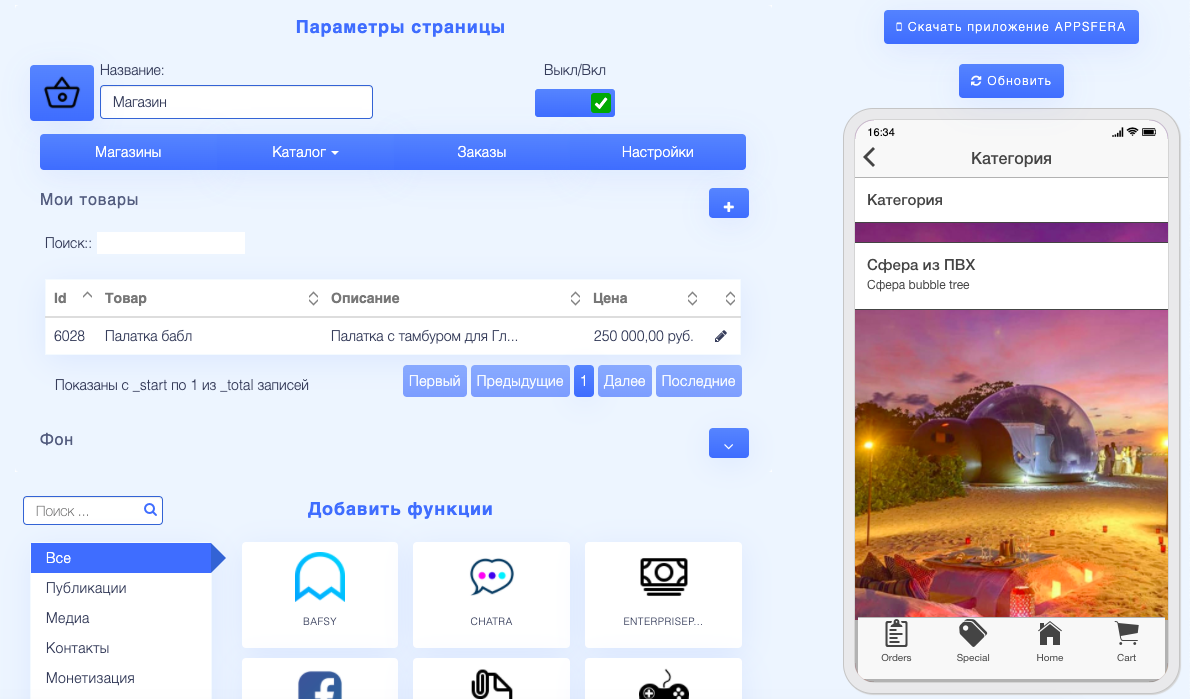 Модуль магазин поможет вам создать полноценное приложение E-Commerce. Идеально подходит для интернет магазина. Создавайте различные магазины, задавайте способы доставки и оплаты, создавайте товарные категории и товары.