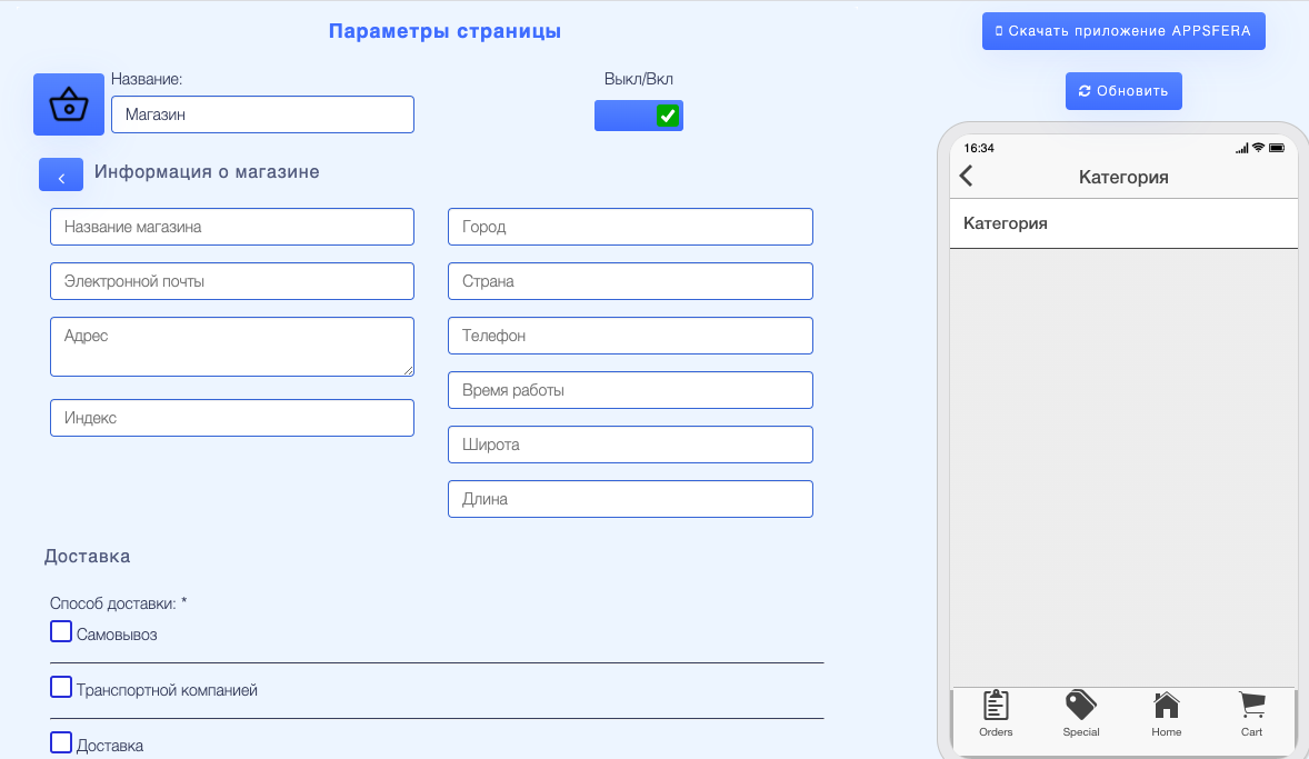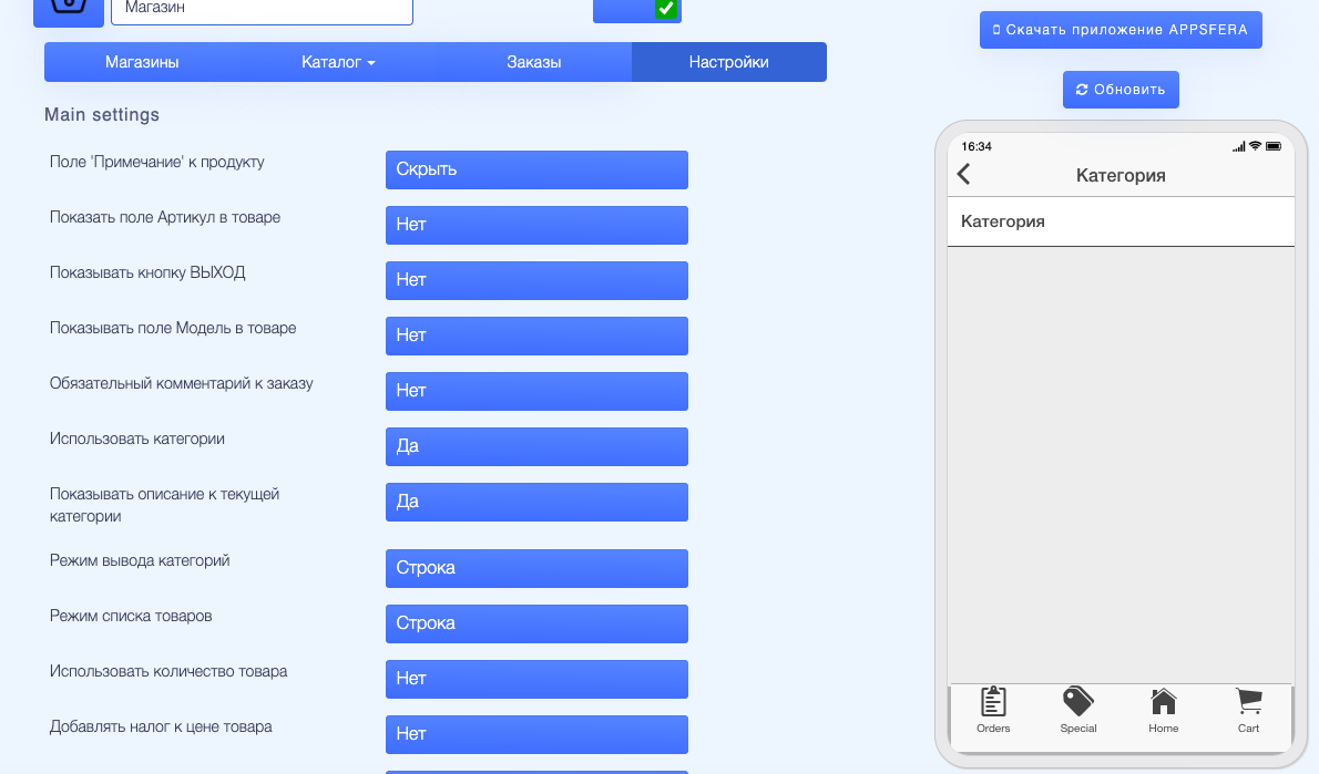 В этом же разделе можете настроить все параметры вашего будущего магазина, в том числе смогут ли пользователи совершать гостевой заказ (заказ без регистрации в вашей системе). Какие данные о себе пользователь должен оставить обязательно для заказа, а какие нет. Использовать ли категории, добавлять ли налог к цене, можете поменять иконки и многое другое.