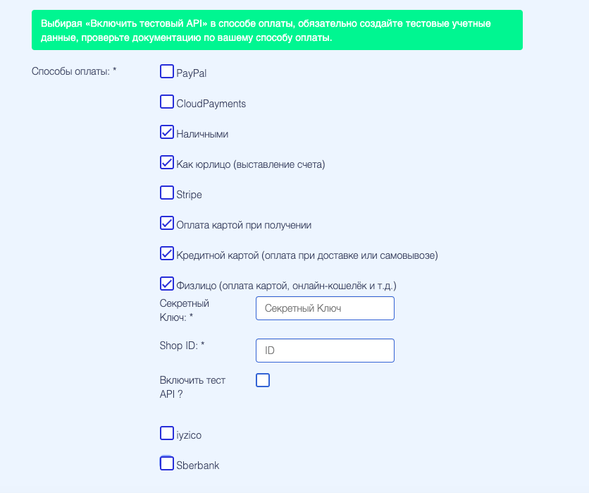 Оффлайн оплаты такие как наличные, выставление счета и оплаты при получение выбираются просто постановкой галочки. Для подключения платежных сервисов Yandex касса, сбербанк онлайн, Cloudpayments^ вам необходимо ввести свои учетные данные в этих системах. Если вы к ним не подключены, то сначала необходимо заключить договора с платежными системами и получить эти данные.