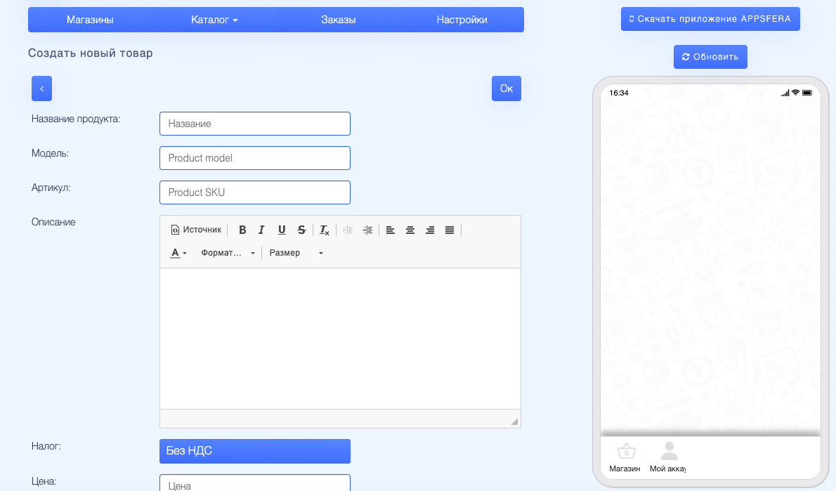 Заполните карточку товара, добавьте фото, поменяйте фон: