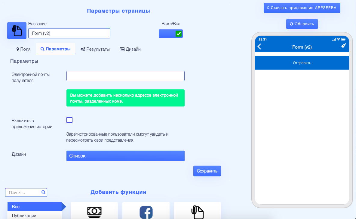 Во вкладке дизайн можно настроить внешний вид. Данная функция идеально подходит для форм обратной связи, проведения опросов, создания форм бронирования и т.д.