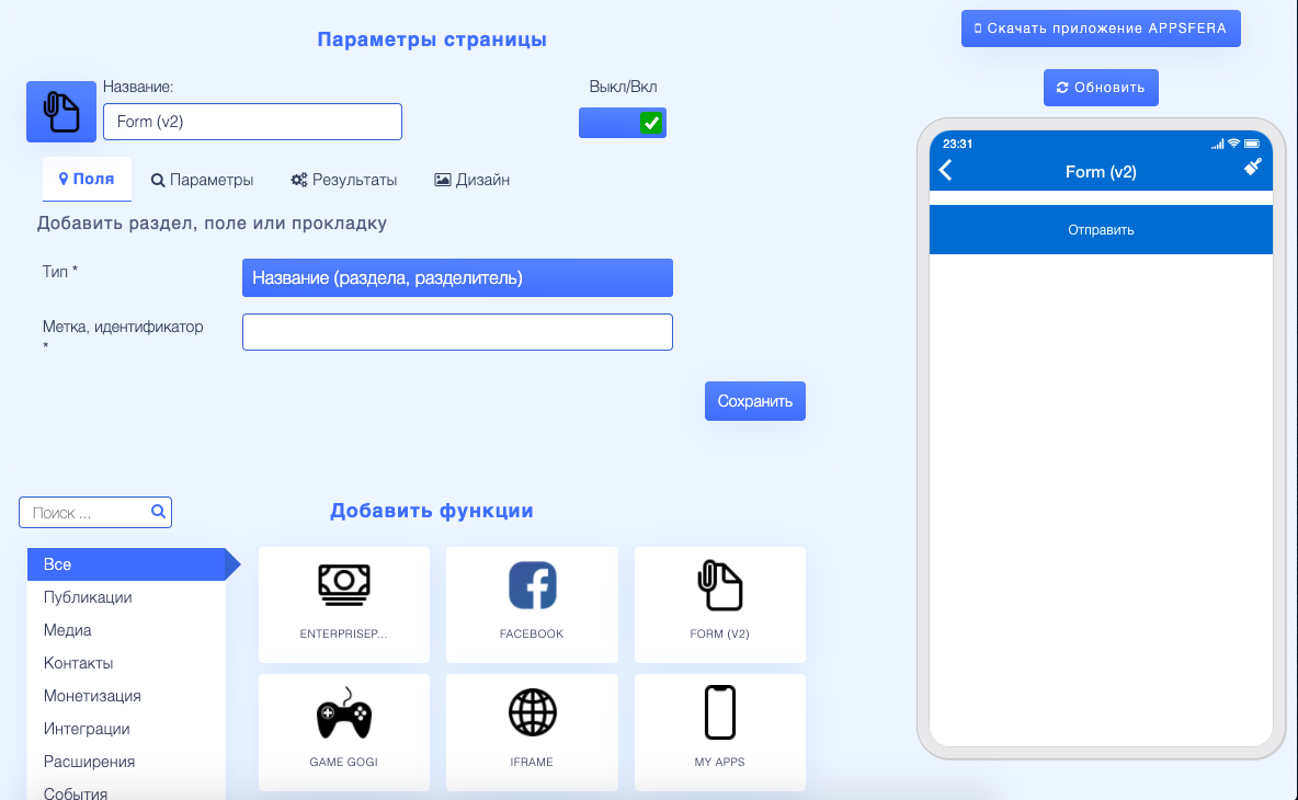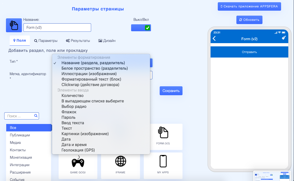 В этой функции вы сможете создавать любые формы обратной связи с клиентом. Выберите различные поля для заполнения из выпадающего списка.
